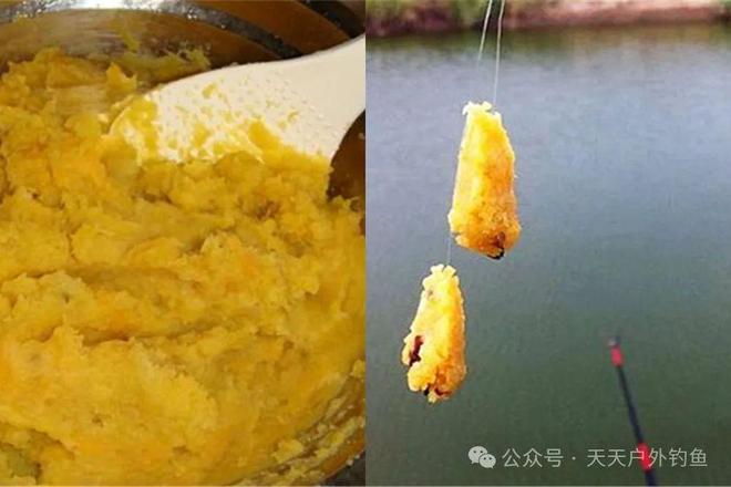 准备玉米粉、麸皮、红薯、蜂蜜、米酒。玉米粉、红薯、麸皮按照4:4:2的比例准备,先把玉米粉和麸皮混合在一起,上锅文火炒出香味。再把红薯上锅蒸熟,冷却之后去皮捣成糊状。所以主料混合在一起,按照这个比例通常是不需要加水的,红薯的粘性足够让饵料成团。加入一点蜂蜜和米酒,量自行控制,少量加一点就可以了,因为自然界中不会有太浓的酒味。反复揉搓到软硬适中,做成搓饵就可以了,这种饵料偏黄色,香甜略带酒香,各种大鱼都非常喜欢吃。黄色的饵料在浅水区域还是非常显眼的,也有助于鱼类更快发现饵料。