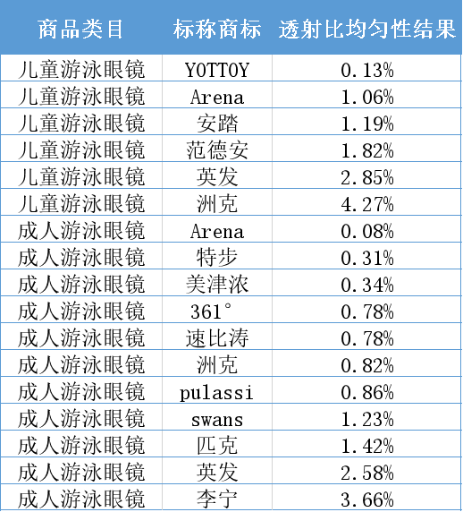 测试结果显示:儿童游泳眼镜中的洲克、Arena、速比涛、英发、安踏、YOTTOY、范德安等品牌表现较优;成人游泳眼镜中的特步、361°、洲克、swans、速比涛、KEEP、李宁、英发、匹克、鲸鱼等品牌表现较优,均达到高于行业标准的防雾性要求。
