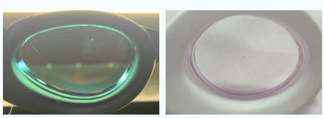 (1)在光线充足处检查镜片瑕疵,应无气泡、划痕或镀层瑕疵,透光均匀无暗区;