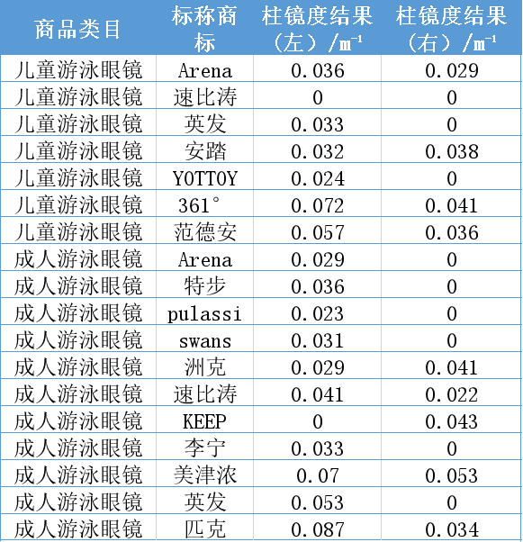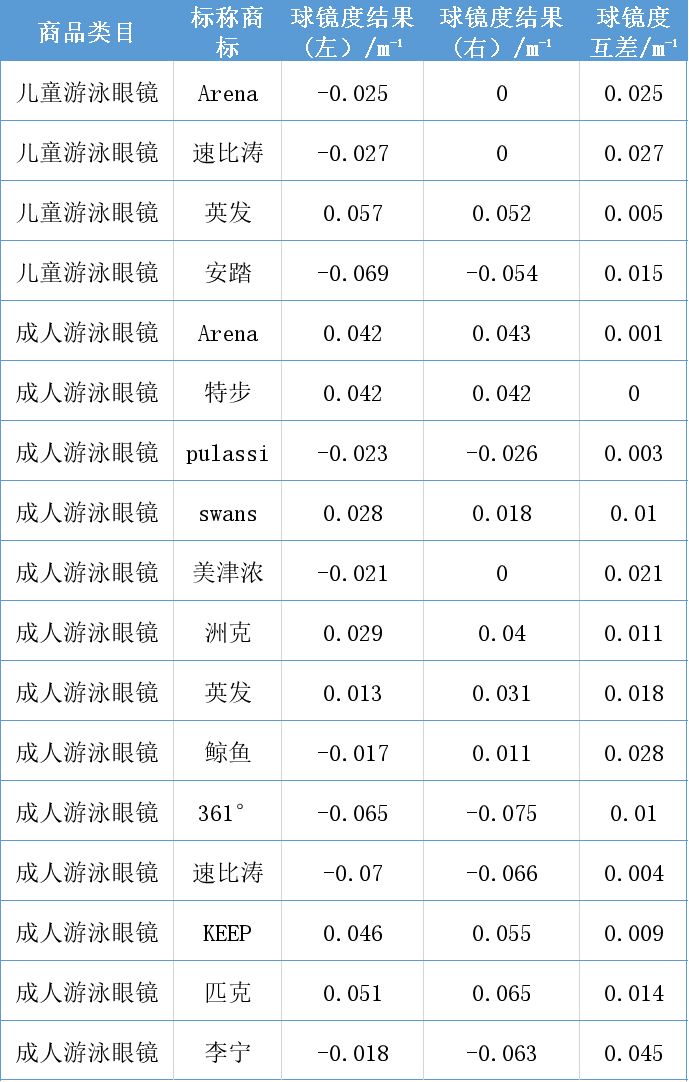 在球镜度和球镜度互差方面,儿童游泳眼镜中的Arena、速比涛、英发、安踏等品牌表现较优 ;